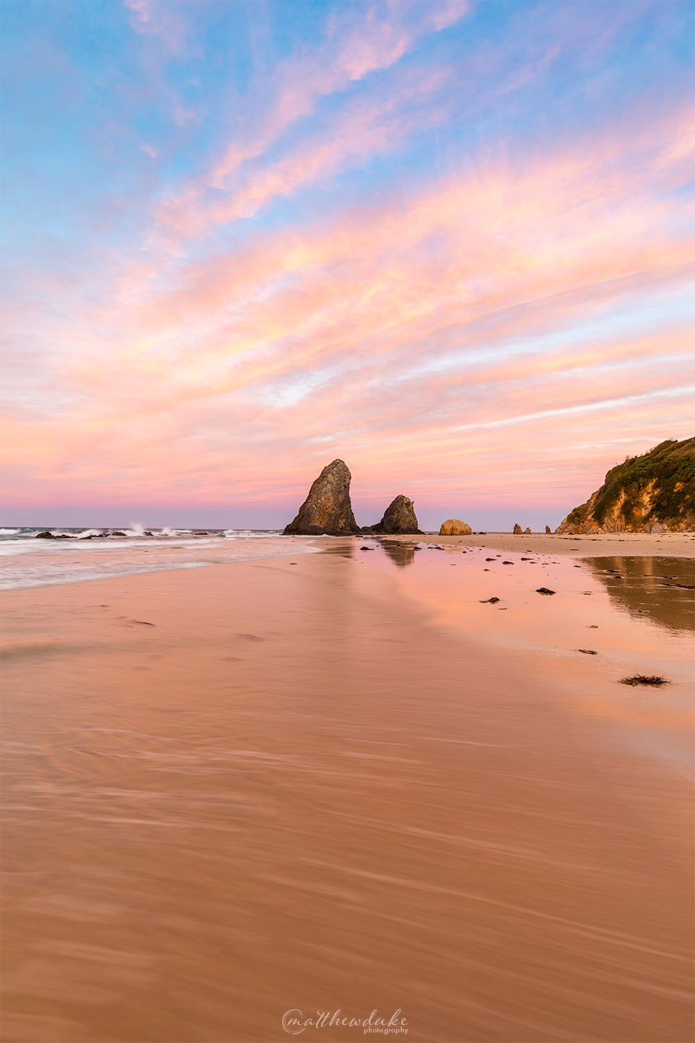 This photograph was taken at sunset as the sky turned the amazing colours of pinks and golden streaks. I particularly loved how the tide was going out, and left the sand wet with beautiful reflections of the clouds above.