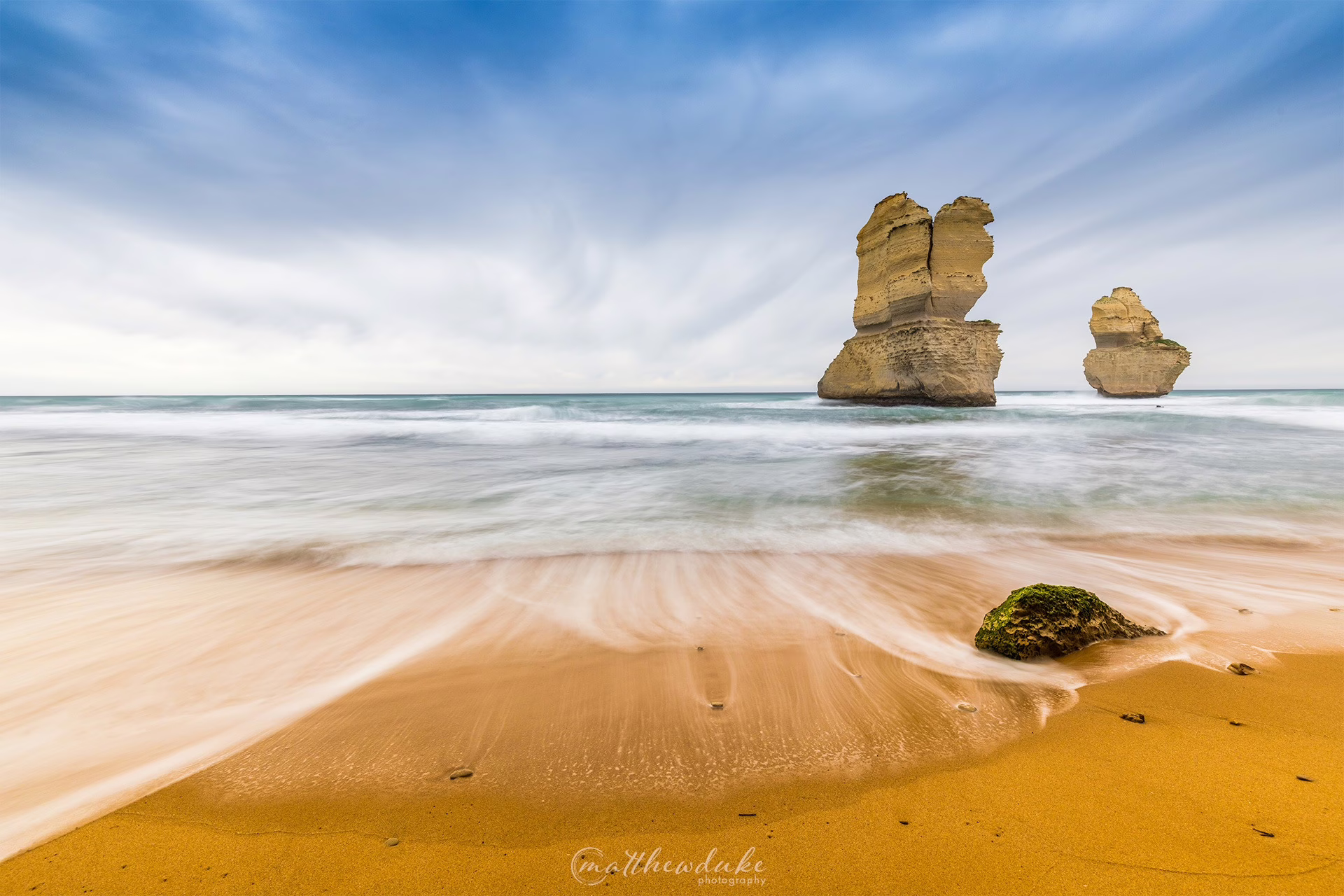 Moody Gibsons Beach – After the steep walk down the steps to Gibsons Beach, and a walk along the sand, it is amazing being so close to these two pillars, which are such an iconic sight of the 12 Apostles along the Great Ocean Road, Victoria, Australia